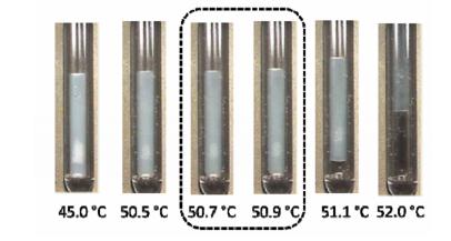 將上面準備好的樣品(圖 1,步驟 4)放入熔點儀JHY90 沸點測量槽中進行測定,設置升溫梯度為 1℃/min,加熱初始溫度為 45℃,終點溫度為 55℃。測量過程通過在線熔點儀軟件進行監(jiān)測,整個過程無需人工監(jiān)督,每次測定結束后分析數(shù)據(jù)。