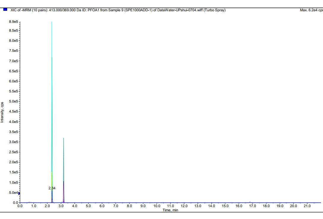 按照前述的方法準(zhǔn)備樣品,在樣品中加入一定體積的PFOA和PFOS標(biāo)準(zhǔn)使用液以及同位素內(nèi)標(biāo)使用液,加標(biāo)濃度為20ng/L,最后得到加標(biāo)樣品待上機(jī)檢測(cè)。