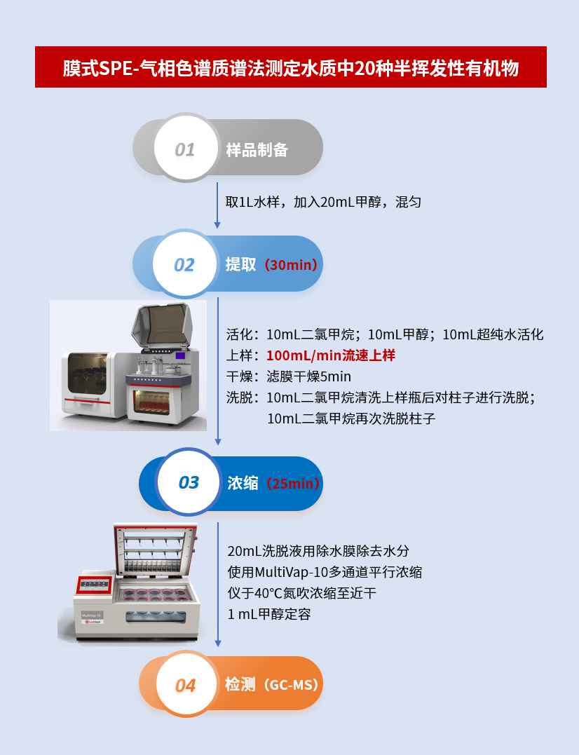 下面,我們附上《膜式SPE-氣相色譜質(zhì)譜法測定水質(zhì)中20種半揮發(fā)性有機物》的流程圖,讓大家能夠更加直觀的感受前處理速度的提升。
