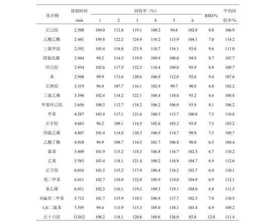 表1統(tǒng)計(jì)了所有化合物的相關(guān)系數(shù)值。22種目標(biāo)物的相關(guān)系數(shù)在0.9972~0.9997之間,滿足《GB/T 18883-2022 室內(nèi)空氣質(zhì)量標(biāo)準(zhǔn)附錄D》要求的曲線相關(guān)系數(shù)需大于0.99。